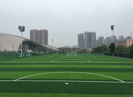 该足球场按照国家专业足球比赛场地技术要求及环保技术要求建设,选用一流的足球训练专用人造草坪。为了减少对运动员的伤害,还专门在水泥地与草垫之间增加了一层减震垫,具有良好的减震和理想的球回弹效果。场内配有国内最好的投光、泛光灯具,照明效果好。