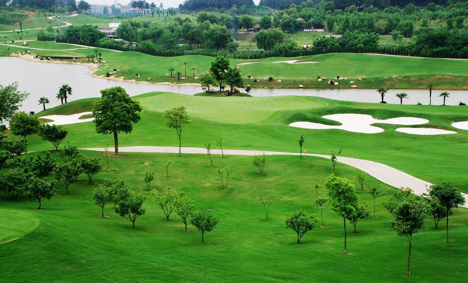 天外天高尔夫乡村俱乐部为亚洲少有依PGA比赛标准所设计建造,堪称中国最具PGA比赛难度的球场。在布局上忠实继承了高尔夫的古典特色:大起伏、大湖泊、沙坑密布等风格,同时距离超远是天外天球场的第一挑战,18洞球道全长7612码,每个球洞至少有5个发球台。从第1洞开始,你几乎没有闲庭信步的可能。这是一个稍带左狗腿的4杆洞,开球时左有草坑、右有沙坑,攻果岭时则左右均有巨大的深沙坑把守。第2洞则让你体验天外天的丘陵感觉:开球第一杆将是盲打,球童会让你对着前方坡形球道的中间偏右开球,从蓝Tee需要200码才能确保越过坡顶。攻果岭时,你则要穿越一片广阔的湖面。从这一洞起,你逐渐开始融入水的世界。