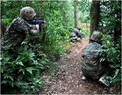 真人CS野战游戏规则及方式游戏中,将参赛队员分成红、蓝两队对抗射击游戏,队员身穿迷彩服,头戴防护盔,手持激光枪,进入丛林中各自的阵地相互射击,搜寻追杀,击中对方时造成"血淋淋的创伤“效果,而对人体却无任何伤害和危险。虽然不是真枪实弹,但同样可以感受到“枪林弹雨”的强烈刺激。