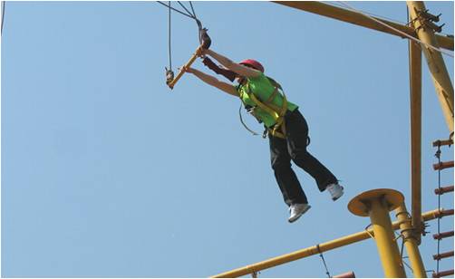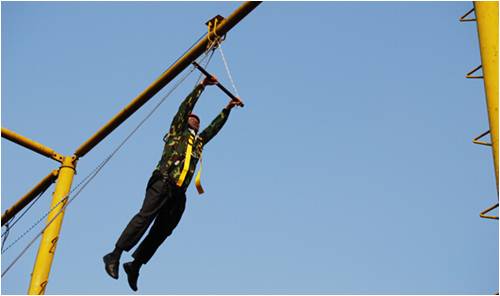 项目简介:极其经典的个人挑战项目。站在10米高空的一个摇摆圆盘上,你的前上方1.5米处有一根迎风摇晃的横杠,你少不了恐惧,你还能鱼跃出去抓住单杠吗?你的心理得到考验,你会如何抉择……