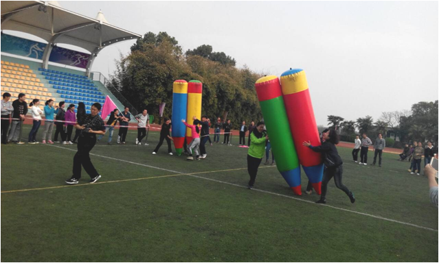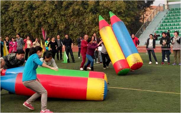 【比赛方法】比赛前,参赛队员在起点立于起跑线后,大铅笔竖躺在地上。裁判发令后,三人齐心协力翻滚大铅笔到达50米的终点。大铅笔全部过线后,方可结束比赛,按用时最短的顺序排名。