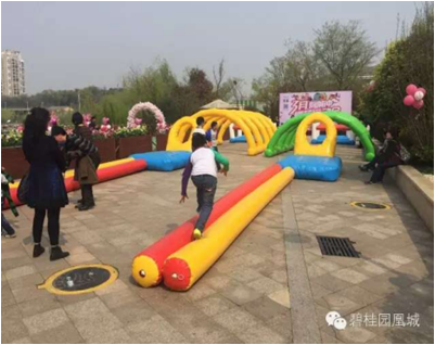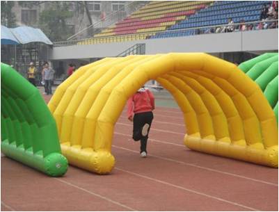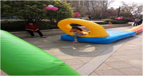 【比赛方法】比赛全程400米,每100内有一个障碍,共四个障碍:第一个独木桥,第二个跨栏,第三个钻彩虹门,第四个钻垫。比赛前,每组每个接力地点站有一名队员,裁判发令后,第一名队员手持接力棒,过独木桥后与第二名队友接力,第二名队友跨栏后将接力棒交给第三名队友接力,第三名队友钻彩虹门后与第四名队友接力。第四名队友钻圈垫后跑到终点结束比赛。按用时最短的顺序排名。