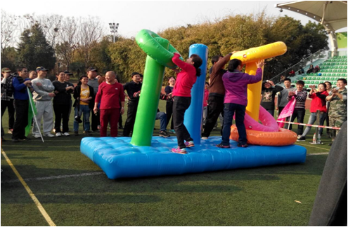 【比赛方法】有三根相邻的柱子,每根柱子之间间隔1米,比赛开始前4名选手都在起点线后,裁判发令后,4名选手齐心协力把第一个柱子上的圈圈全部搬运到最后一个柱子上面,比赛开始前,第一个柱子上由大到小的按顺序叠放着充气圆盘,4名选手需要充分配合,将叠放在第一个柱子上面的圆盘逐一移动,直至所有圆盘按顺序叠放在第三个柱子上。按用时最短顺序排出名次。
