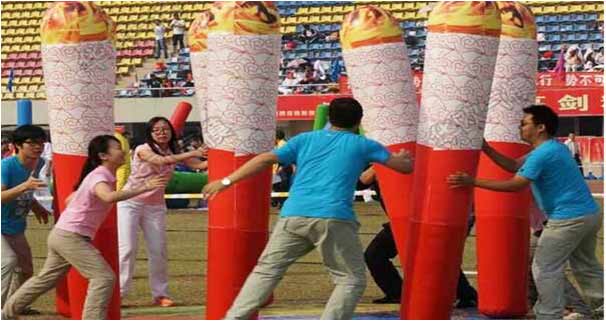 【比赛方法】参赛选手两两相距3米围成圆圈站立,每人手中立着一根充气的圆木。裁判发令圆木不动并保持直立,所有参赛队员顺时针由本人所在位置移动到右手边队友所在位置并扶助队友原先的圆木保持其不倒。每个队员移动8次回到最初的起点,比赛结束。按用时长短排名,用时越短排名越前。