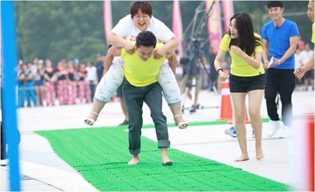 挑选闯关队1名男士1名女士进行配合,闯关时男生背女生跑一段距离与第三关的人员击掌,第三位闯关者接着进行闯关。